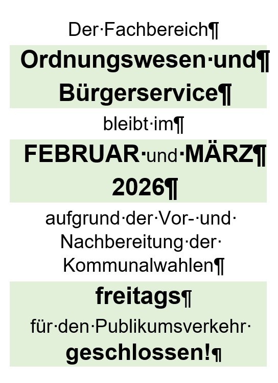 Der Fachbereich Ordnungswesen und Bürgerservice bleibt im FEBRUAR und MÄRZ 2026 aufgrund der Vor- und Nachbereitung der Kommunalwahlen
